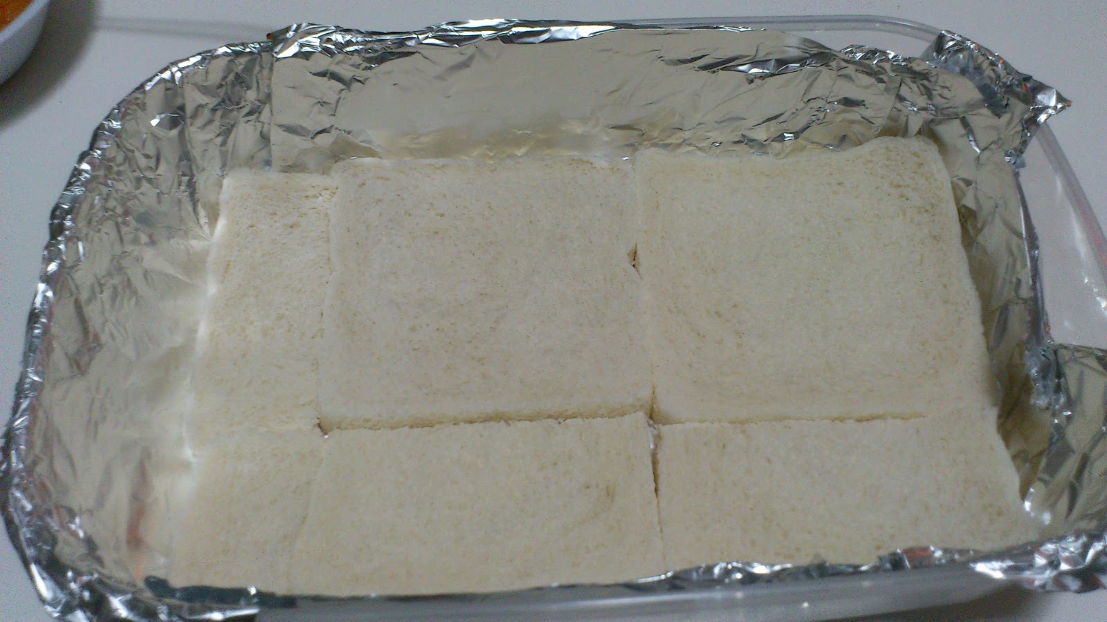 En una de las bandejas cubrir con papel aluminio hasta los bordes. Ponemos sobre él una capa de pan de molde sin corteza y vamos cubriendo toda la base de la bandeja sin dejar huecos, bien apretadito.